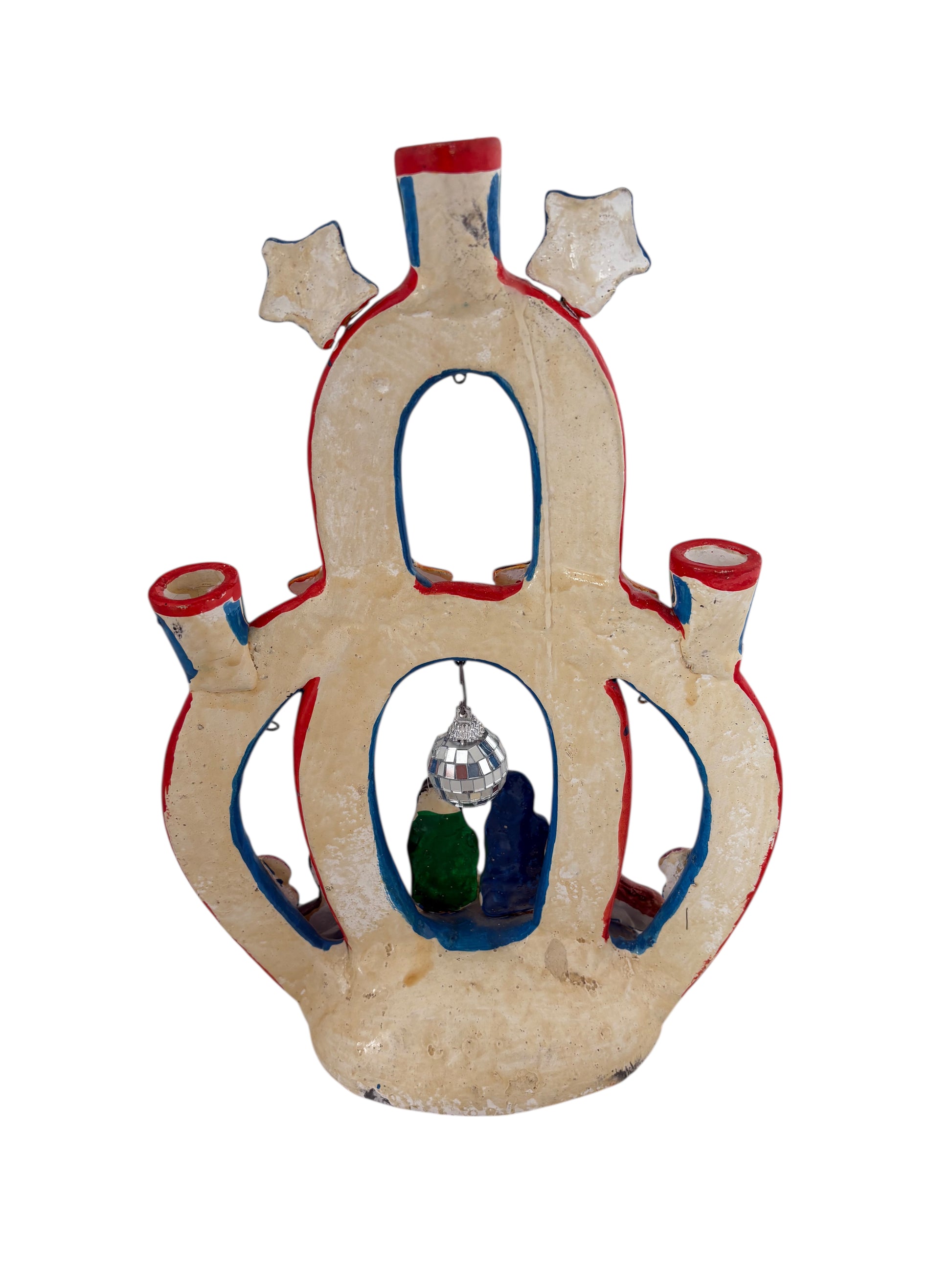 Vintage, hand-painted Mexican pottery. Beautiful and vibrant, with a disco ball added here at the studio.